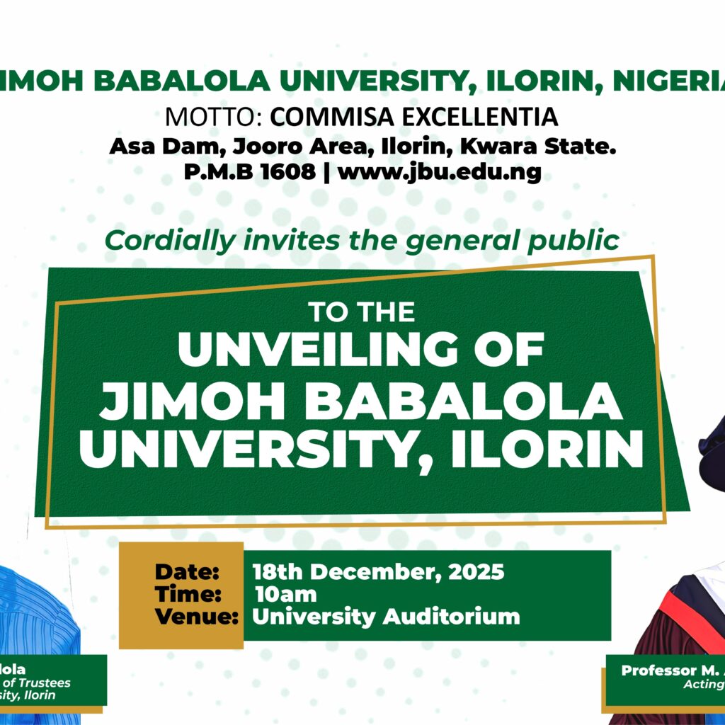 Jimoh Babalola University (JBU) is now open! JBU features state-of-the-art facilities, experienced faculty, and a commitment to providing quality education to all students.